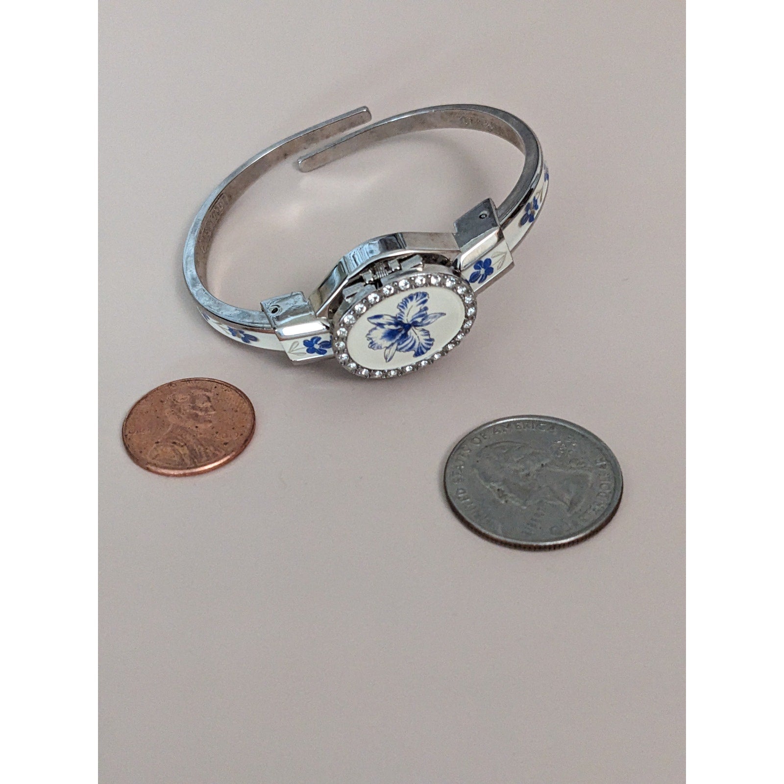 Andre Mouche Silver Tone Peek a Boo Watch Blue Floral Enamel White Gems Working