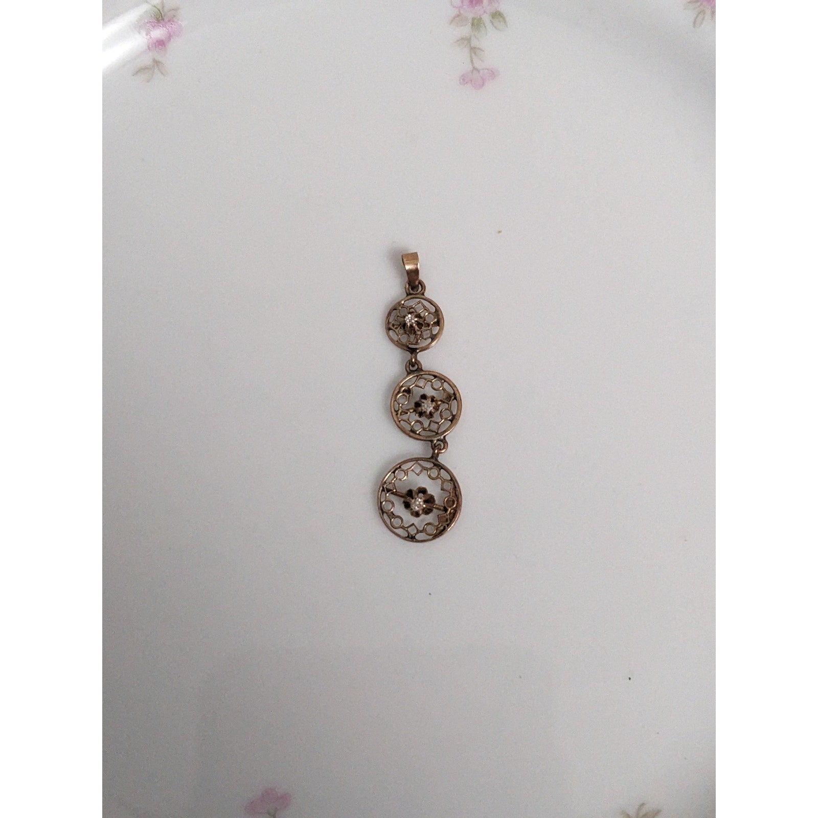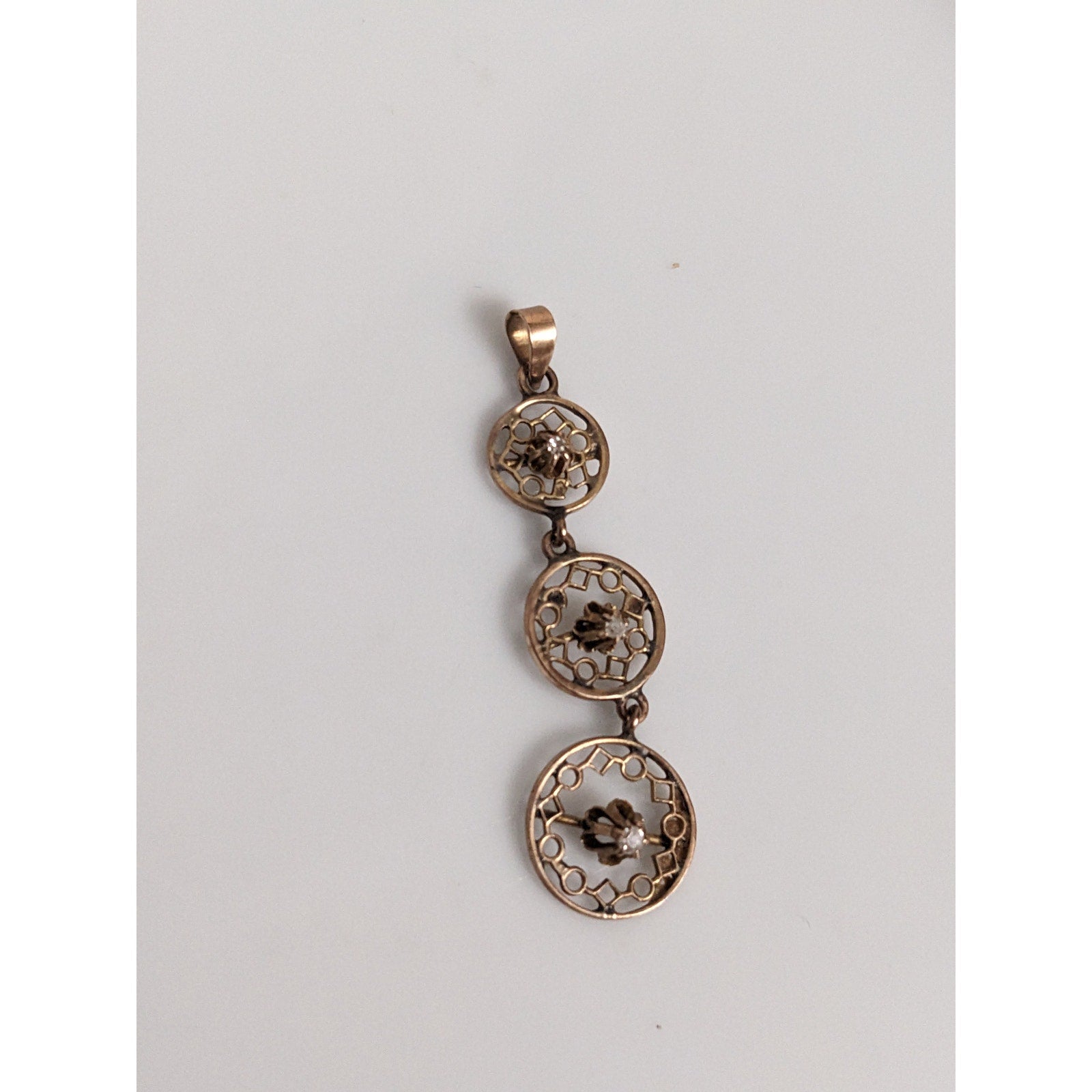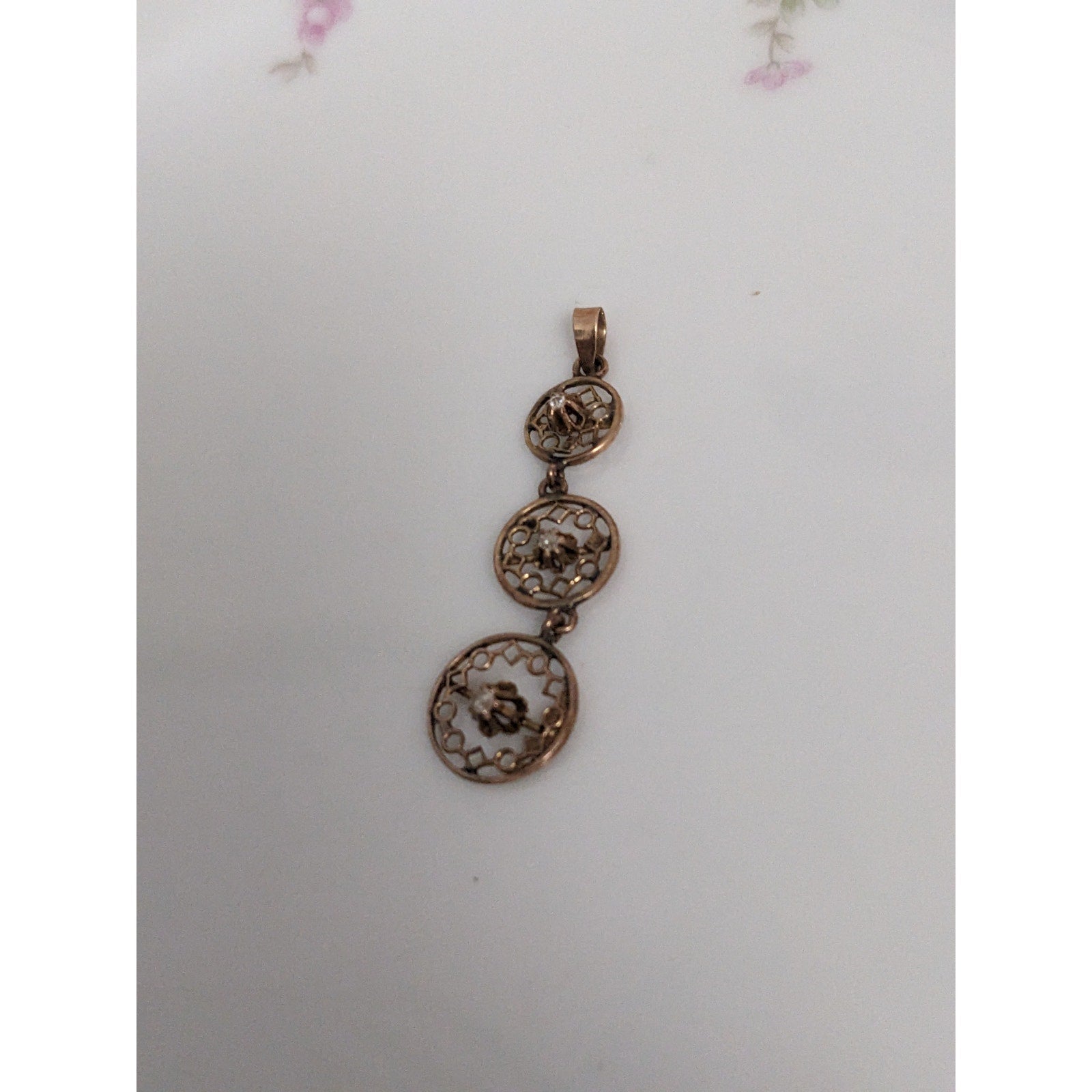 Antique 10k Gold Triple Drop Circular Filigree with Diamond Accent Pendant