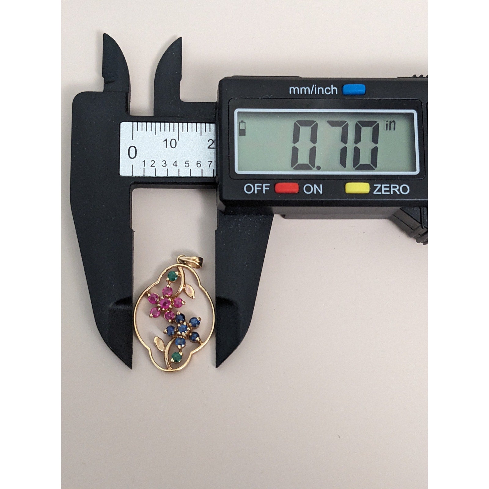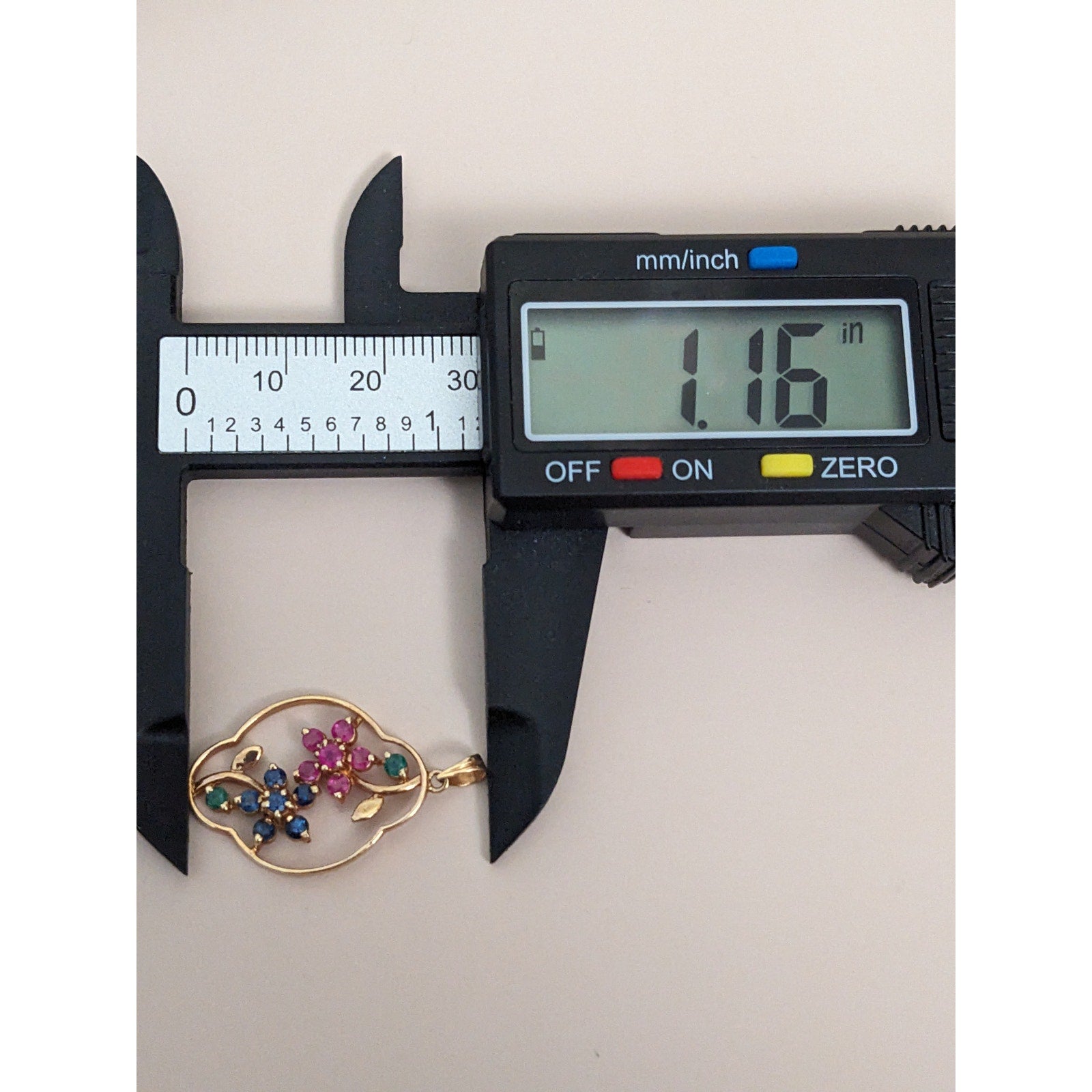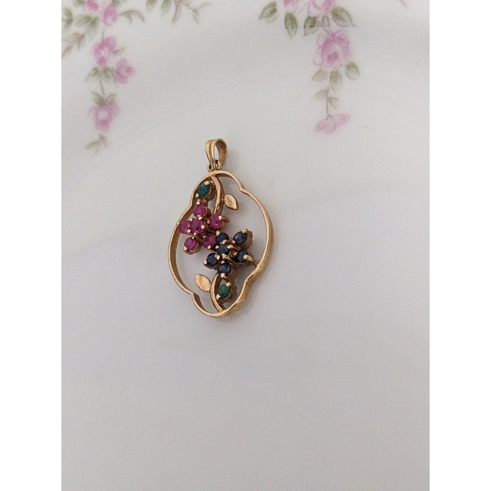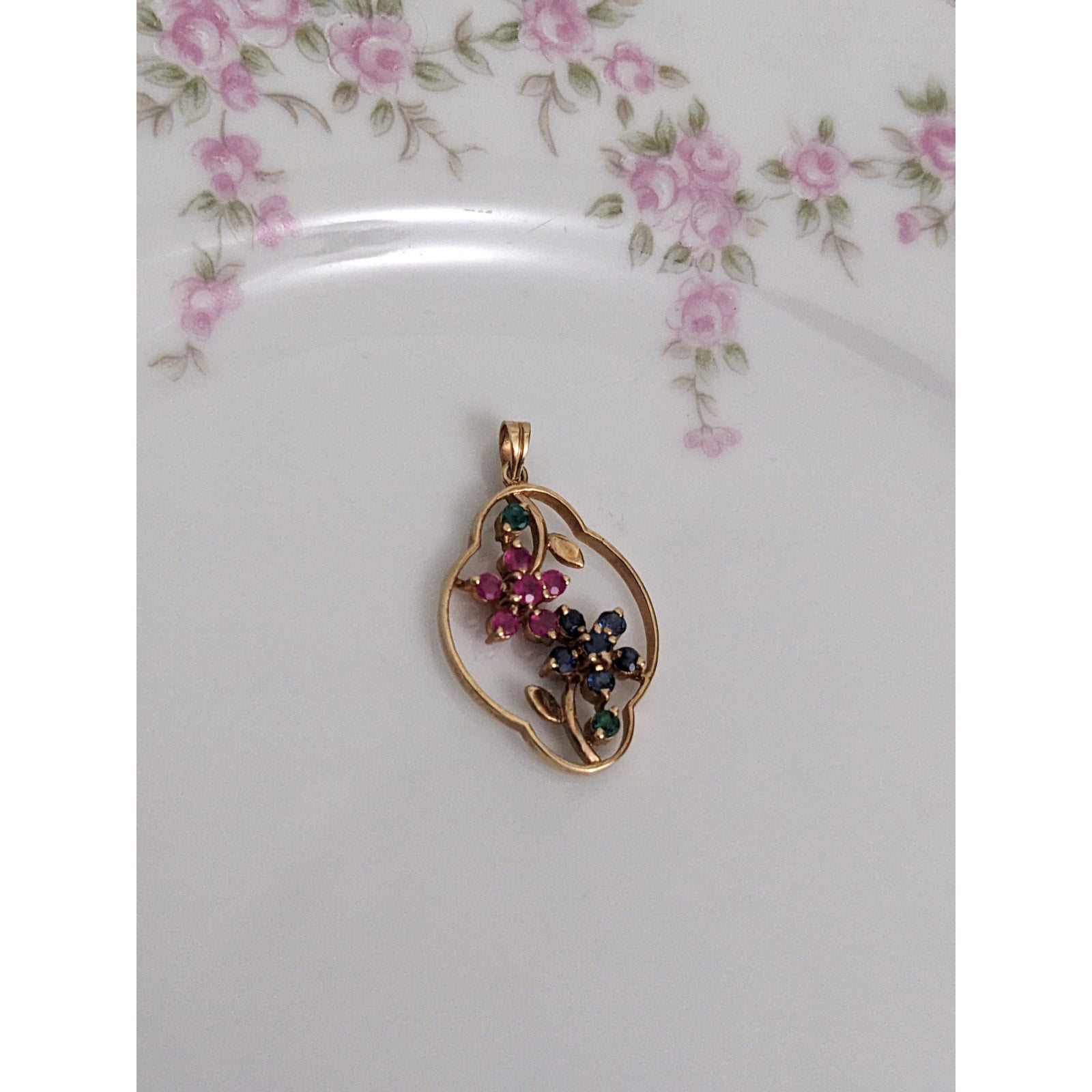 Estate 14k Yellow Gold Pink and Blue Gem Flowers Pendant