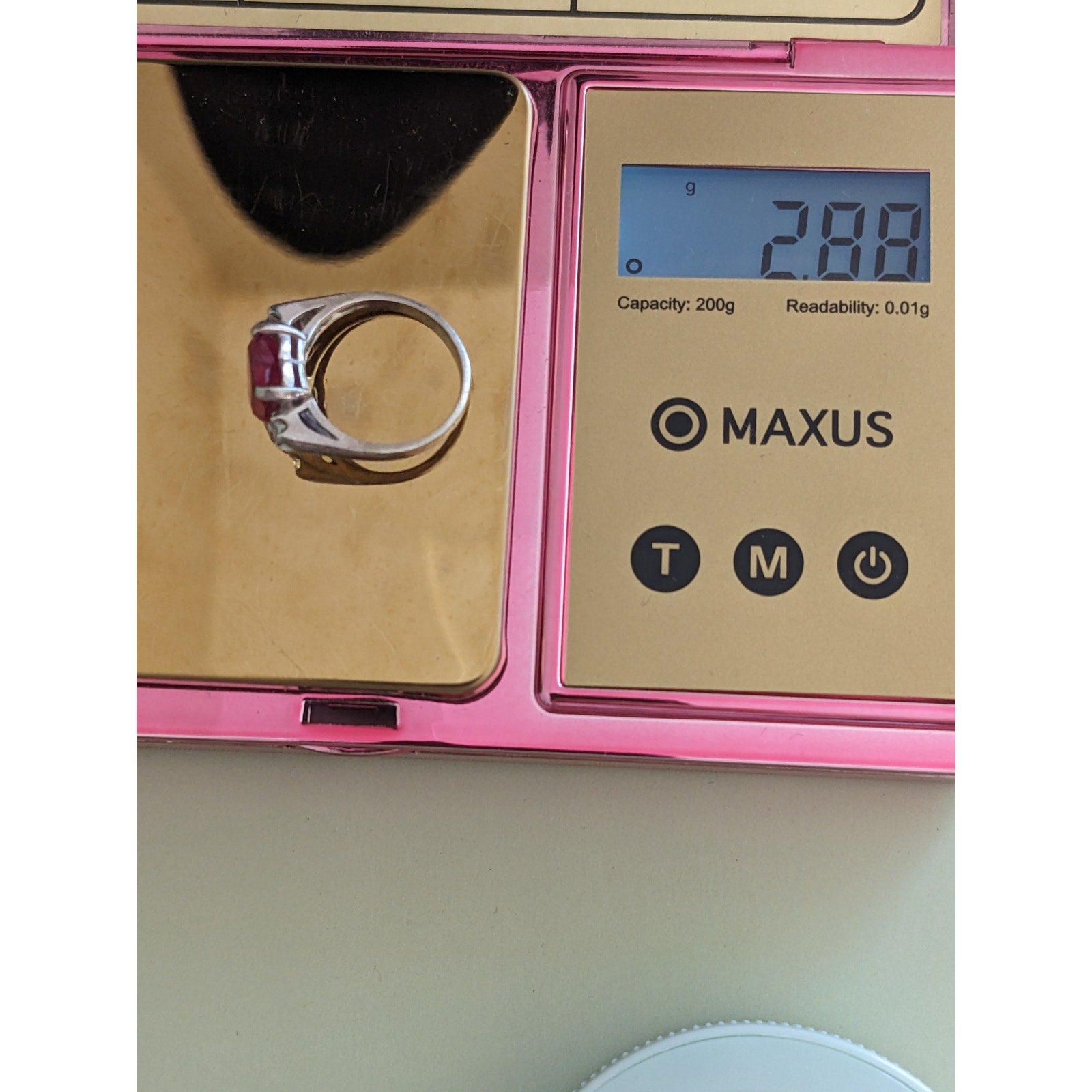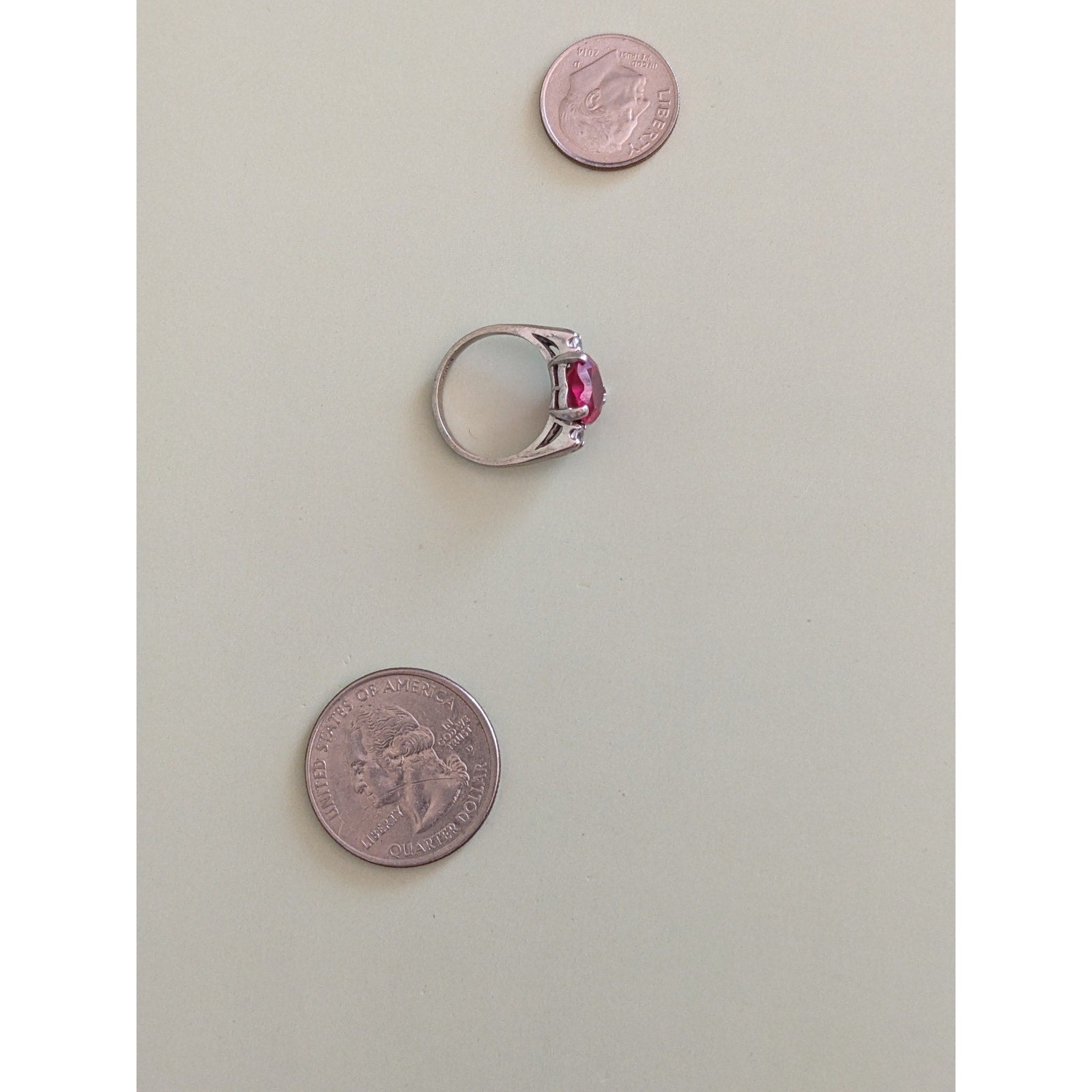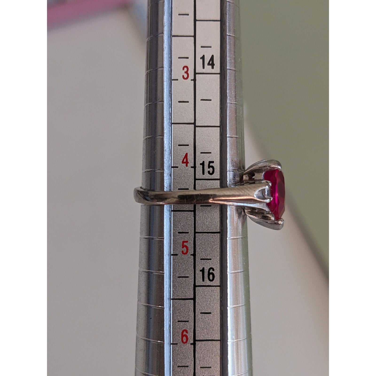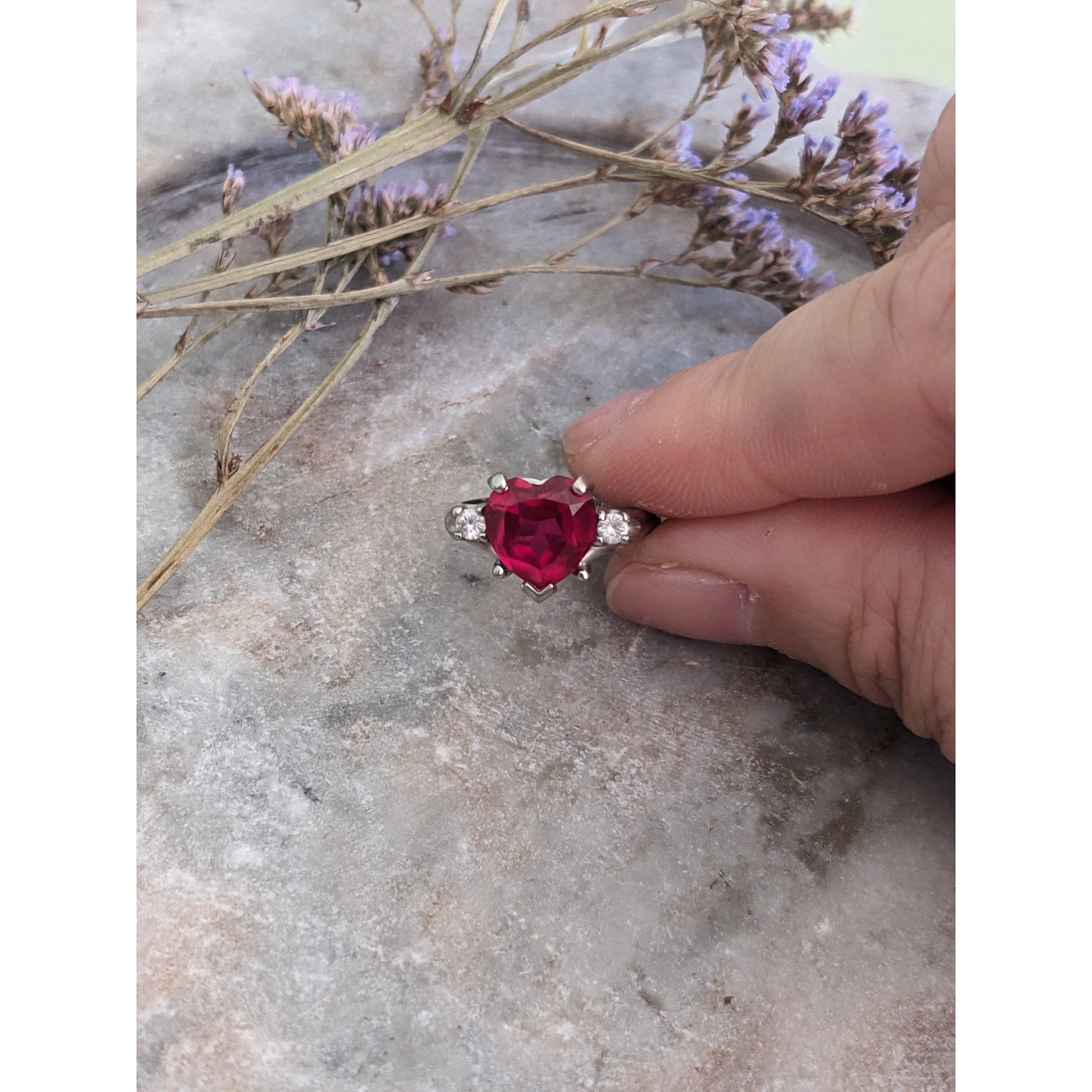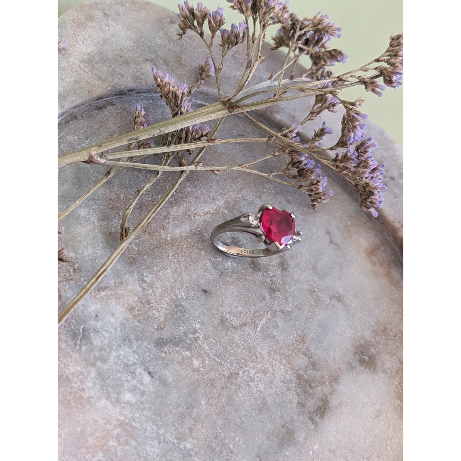 Vintage 10k White Gold Ring with Red Heart Gem and Diamond Accents Size 4.25