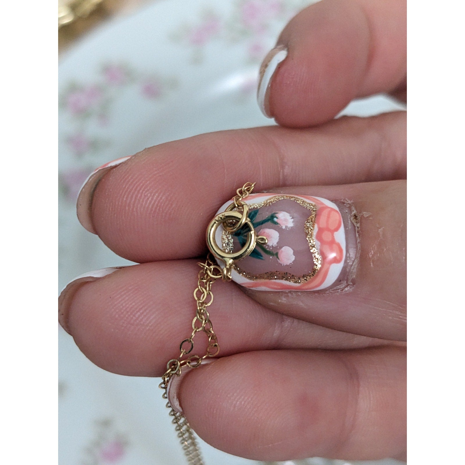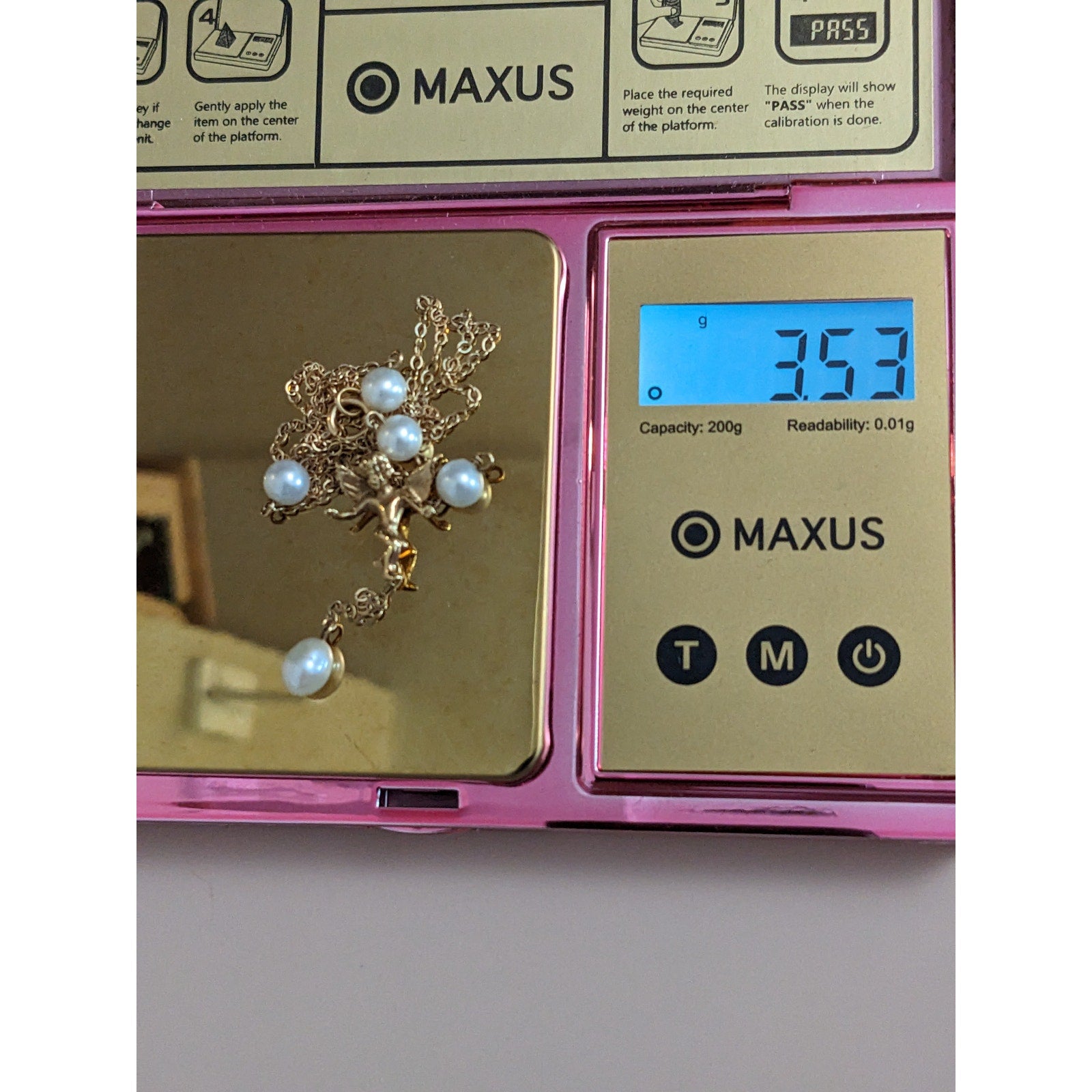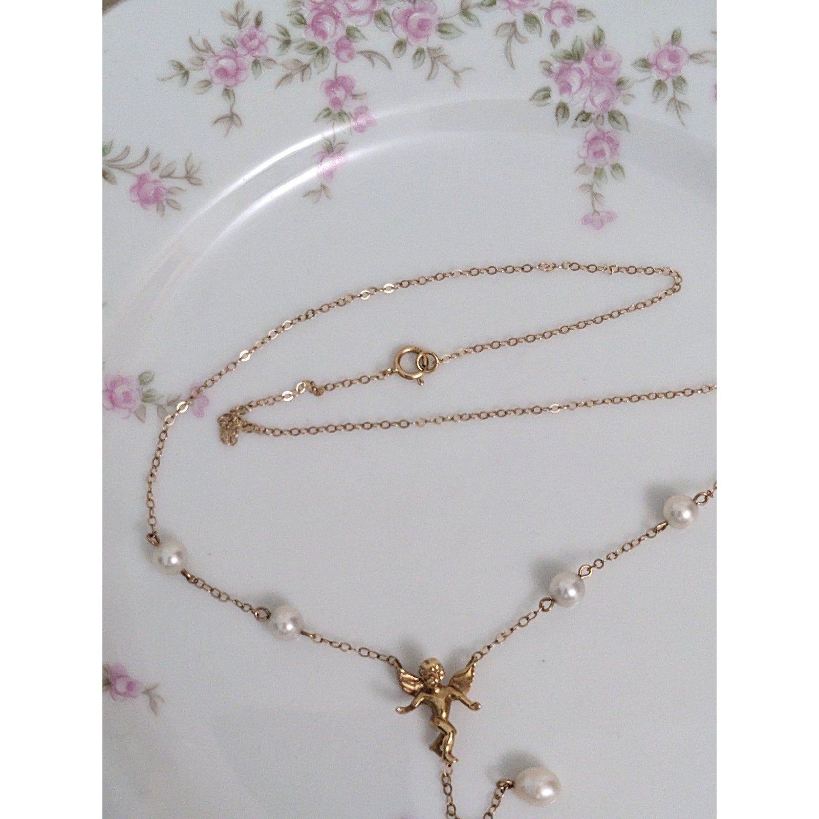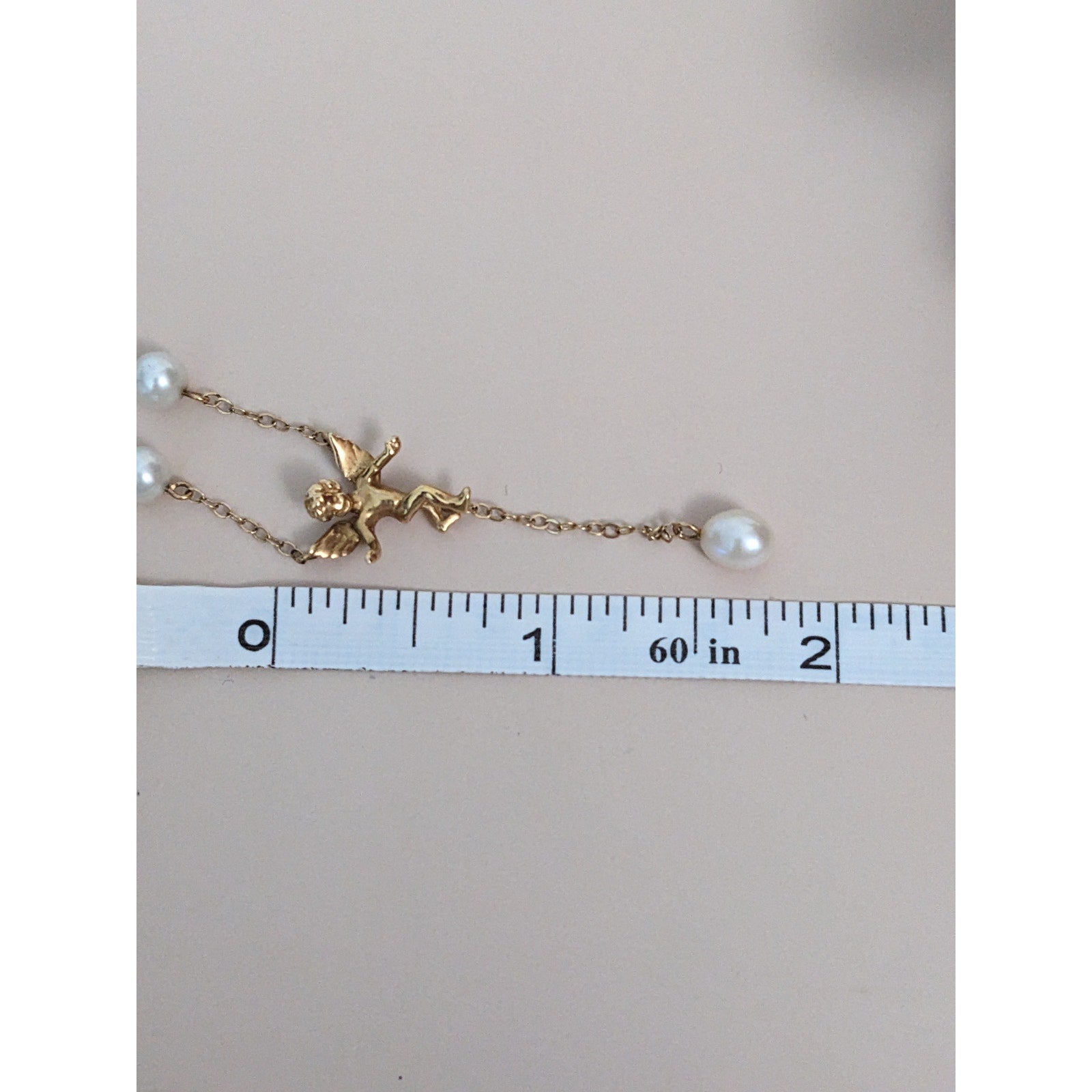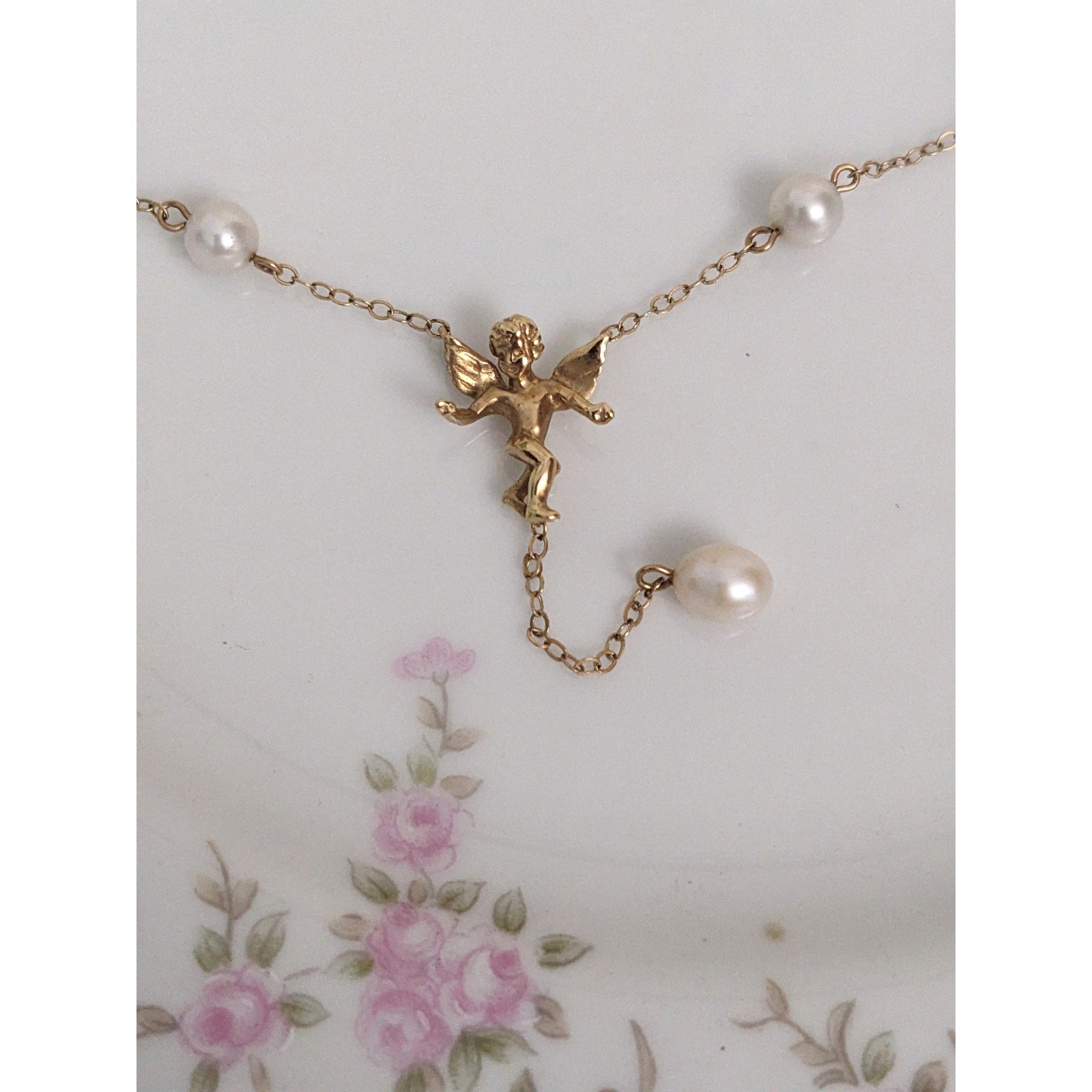 Vintage 14k Dainty Pearl and Chain Necklace with Dangling Cherub Angel 16.5in