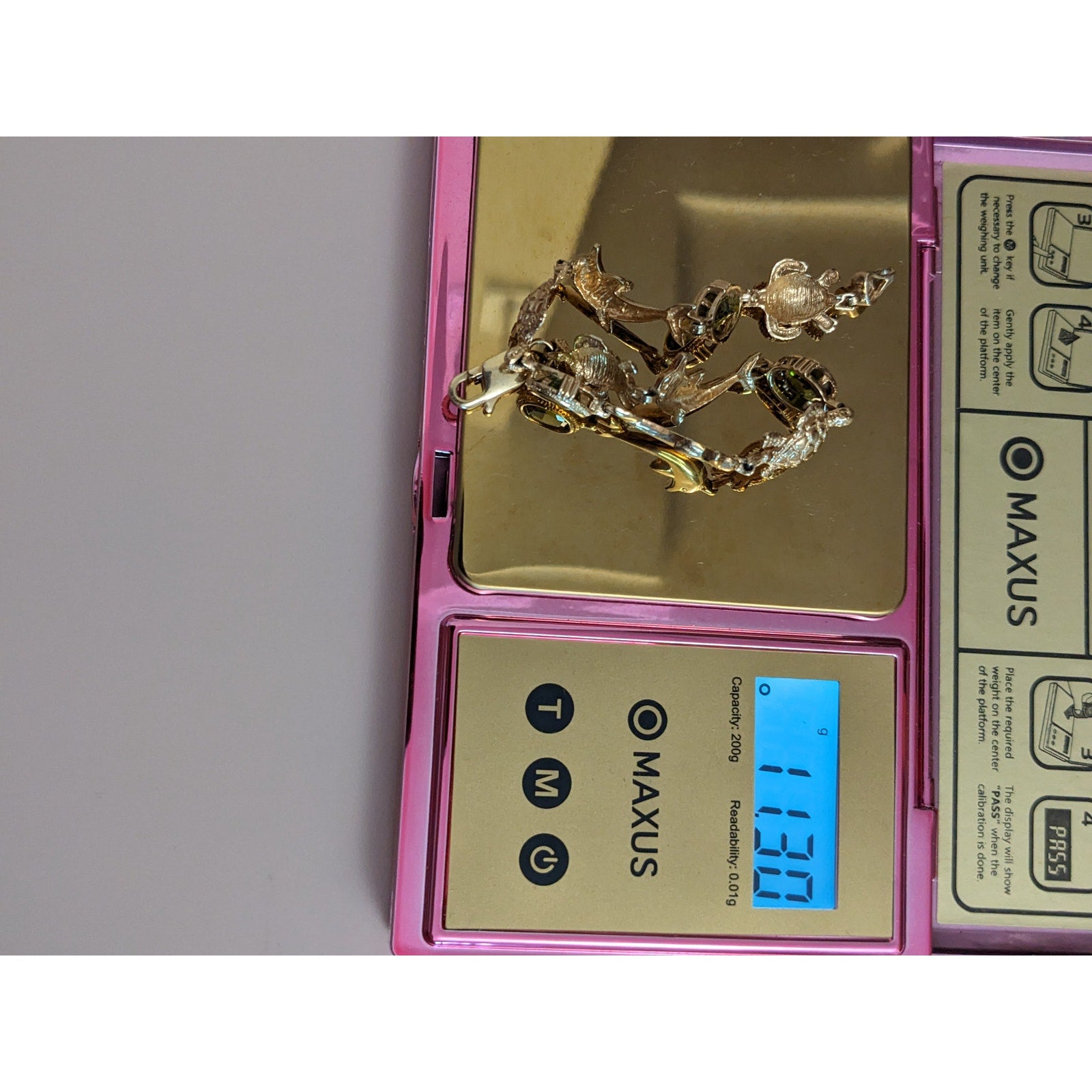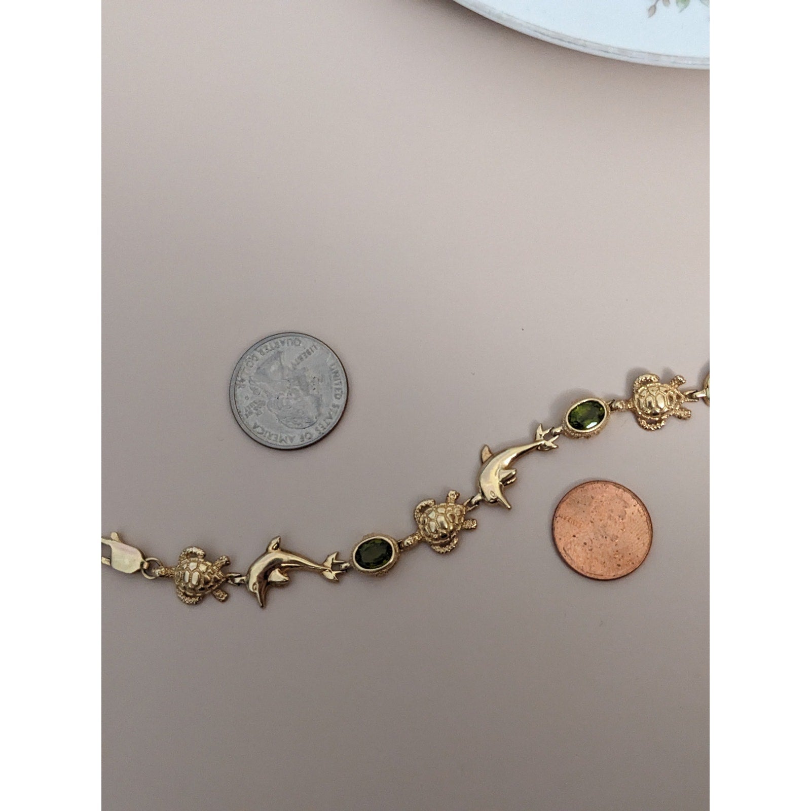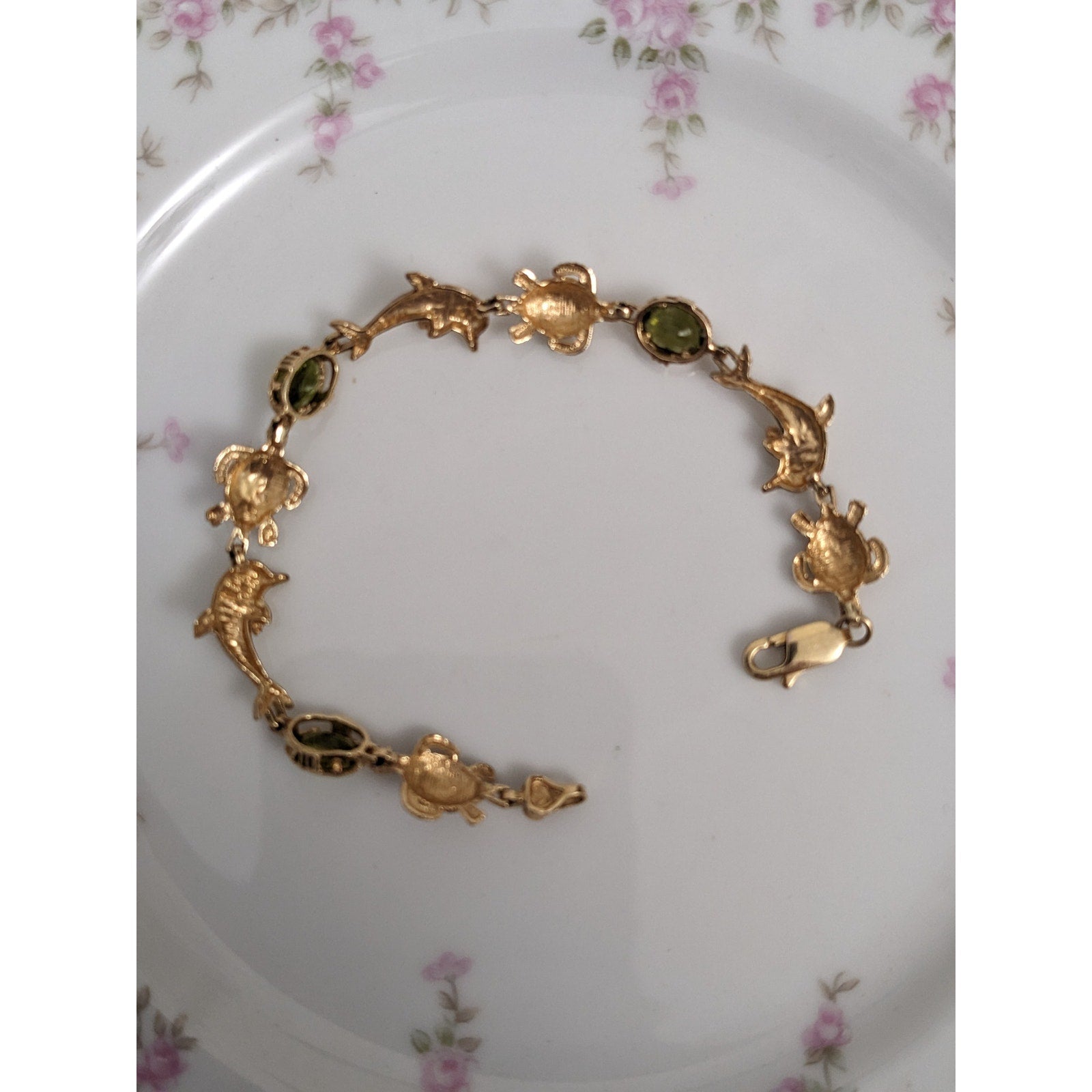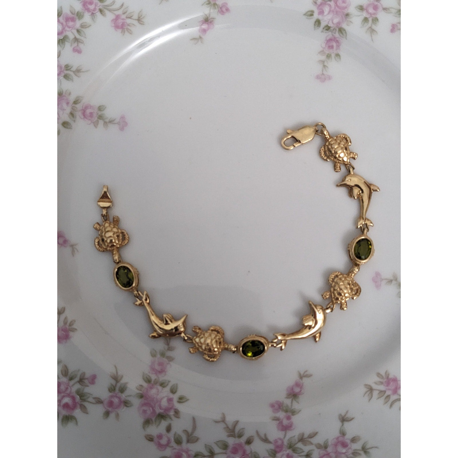 Vintage 14k Yellow Gold Peridot Turtle and Dolphin Bracelet 7.5in