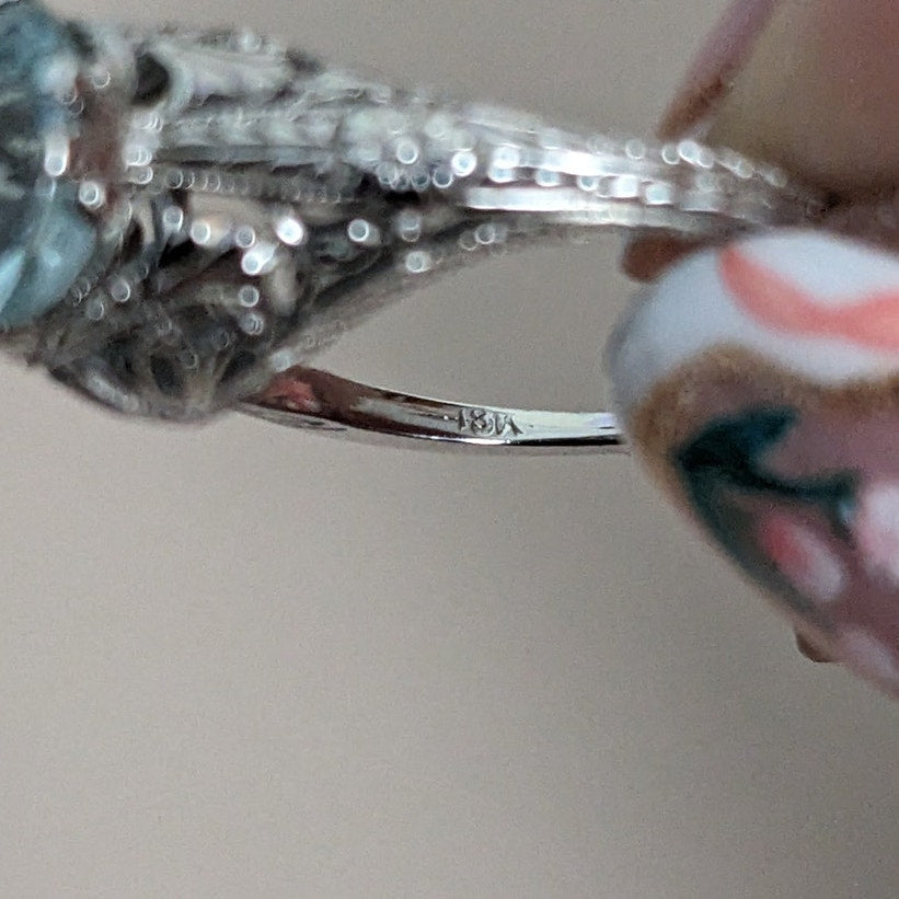 Vintage 18k White Gold Light Blue Gem with Filigree Design Ring Size 6.75 US
