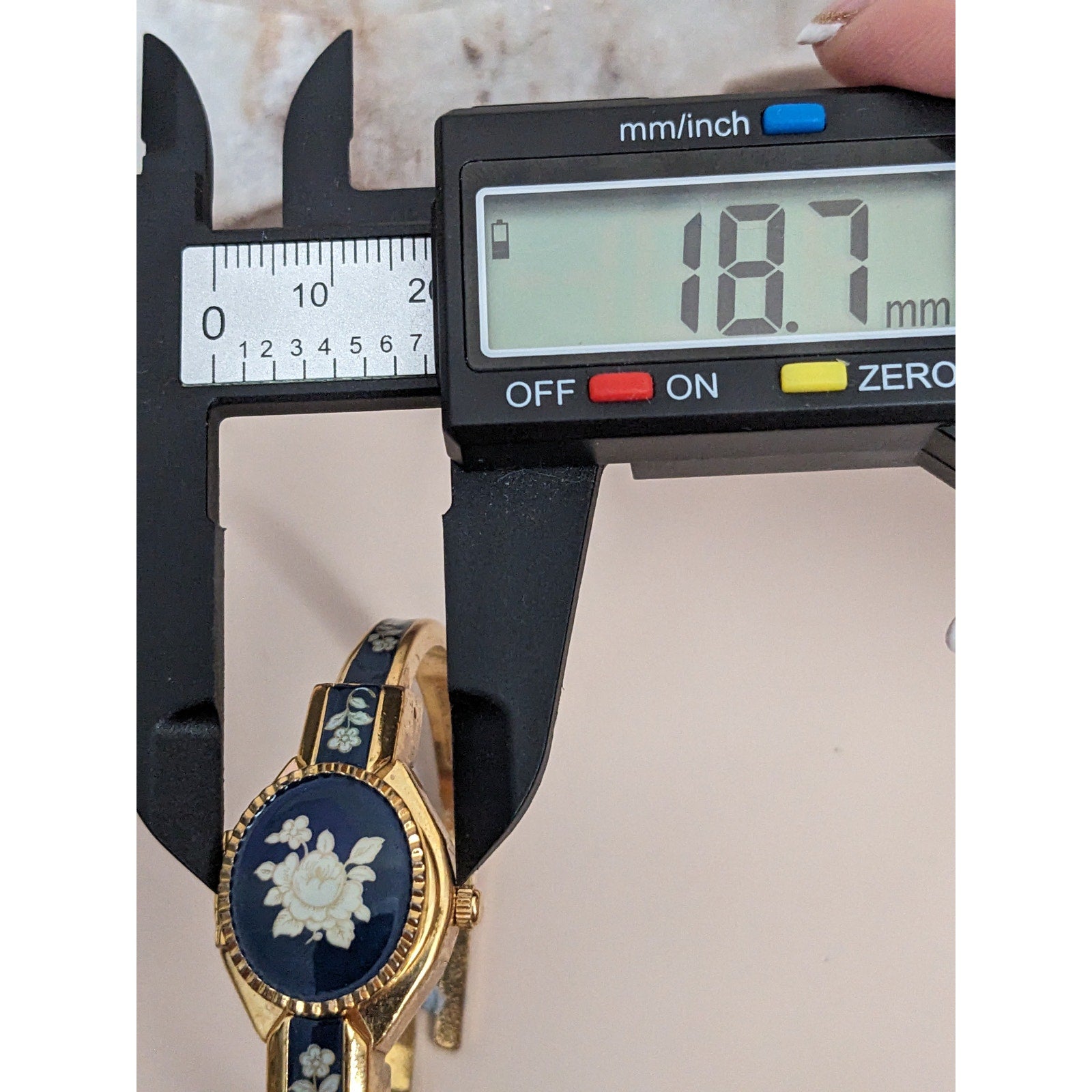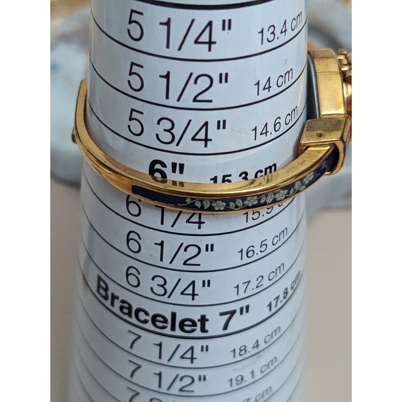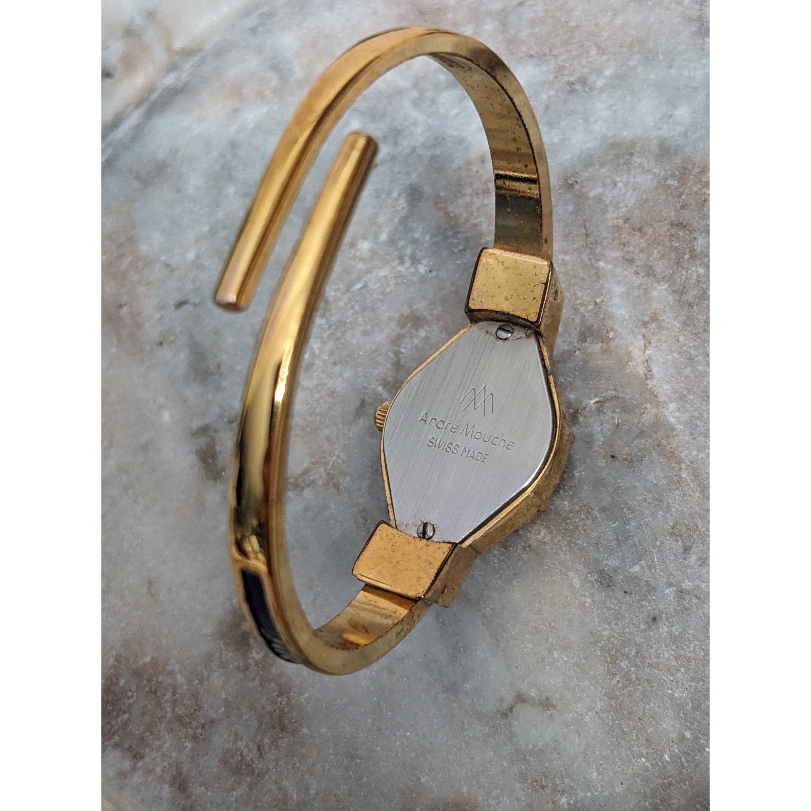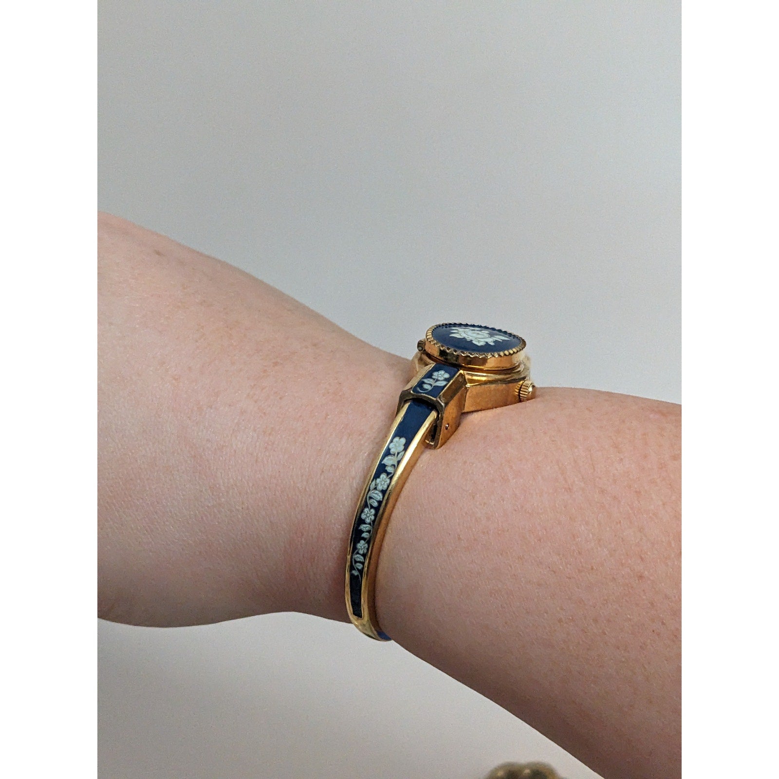 Vintage Andre Mouche Gold Tone Bangle Watch with Deep Blue Floral Enamel Working