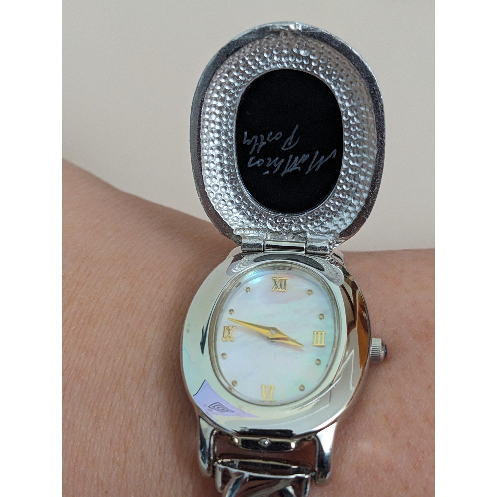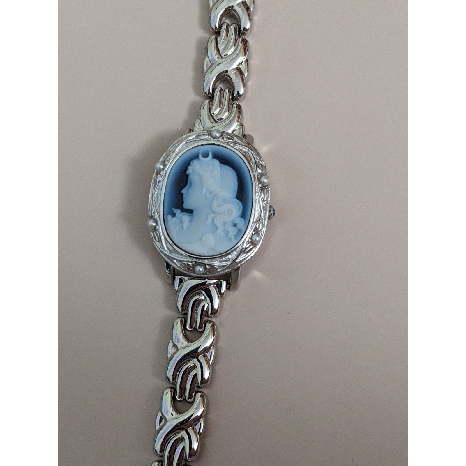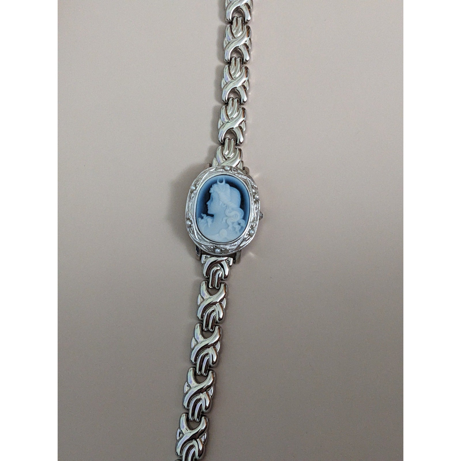 Vintage Andre Mouche Silver Tone Bangle Watch with Blue Floral Enamel Working