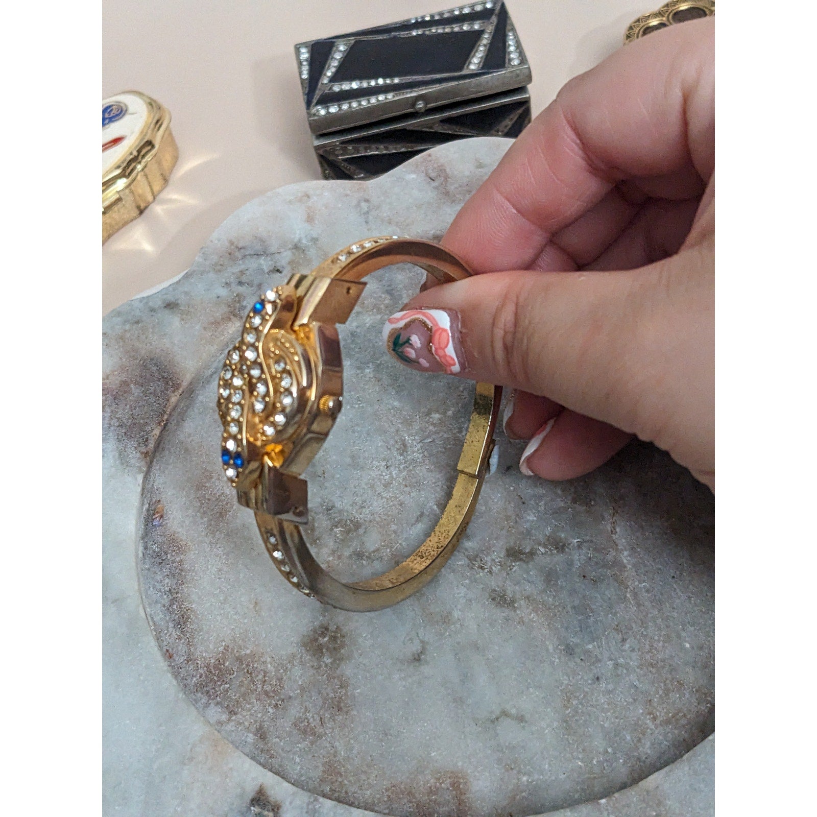 Vintage Andre Mouche Silver Tone Bangle Watch with Blue Floral Enamel Working