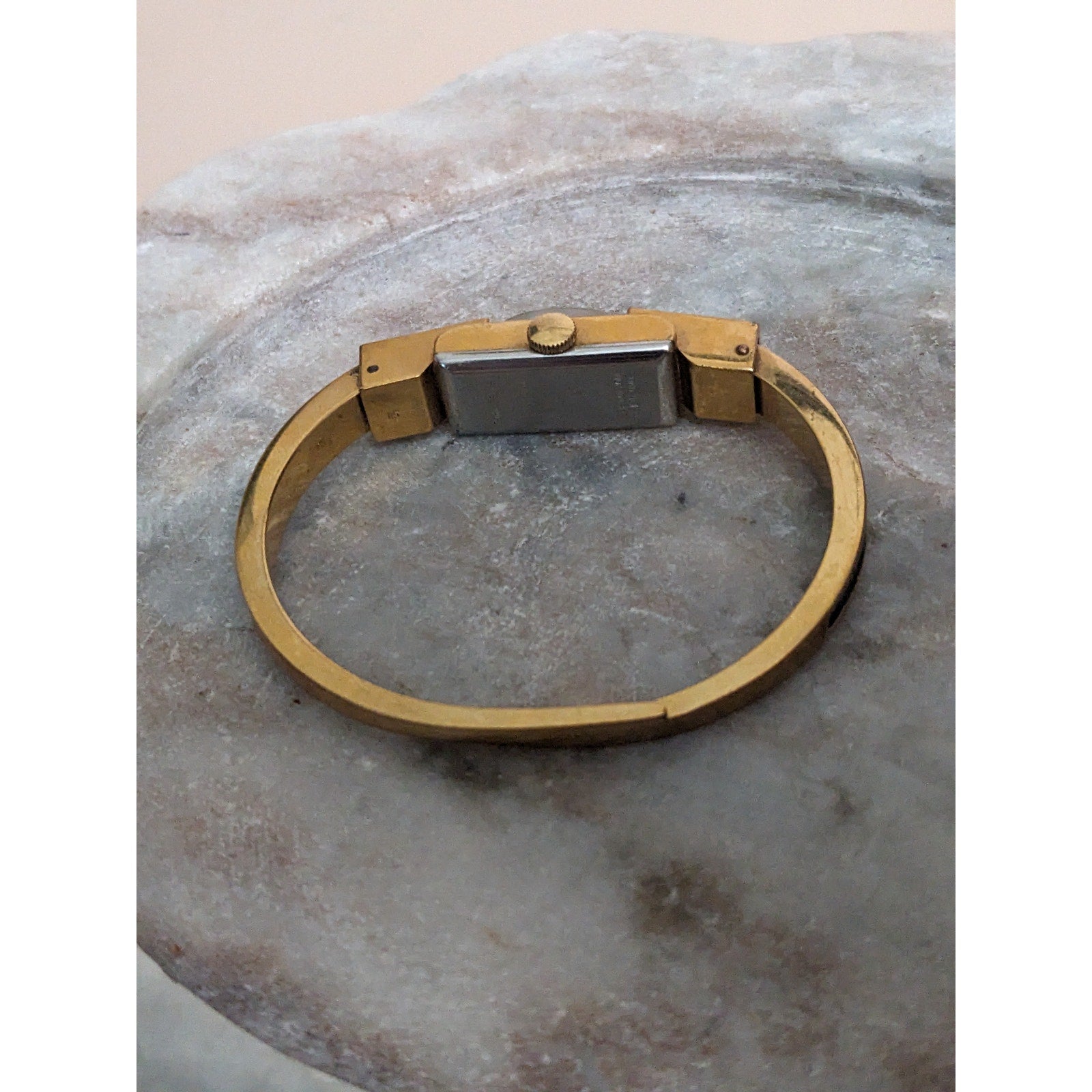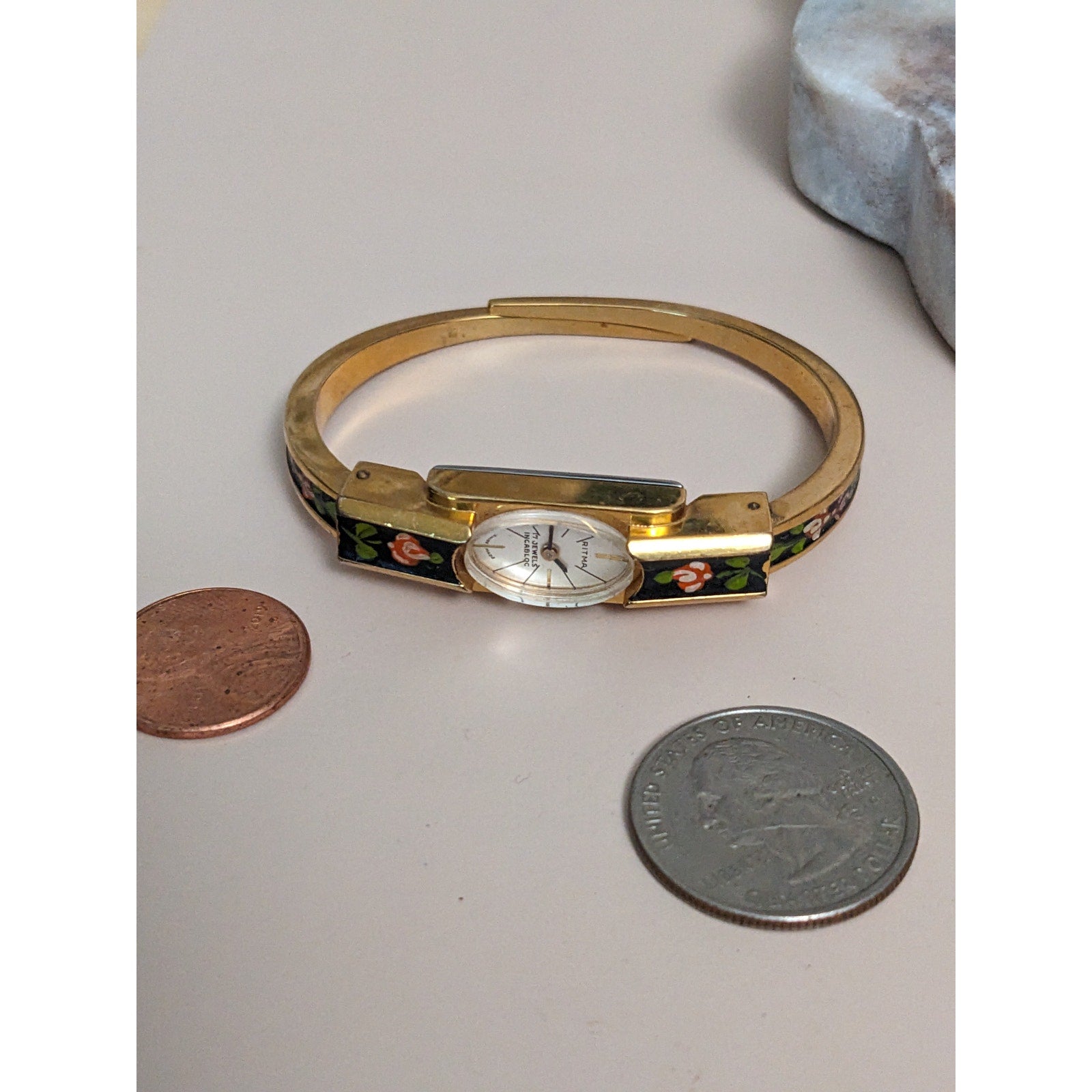 Vintage Andre Mouche Silver Tone Bangle Watch with Blue Floral Enamel Working