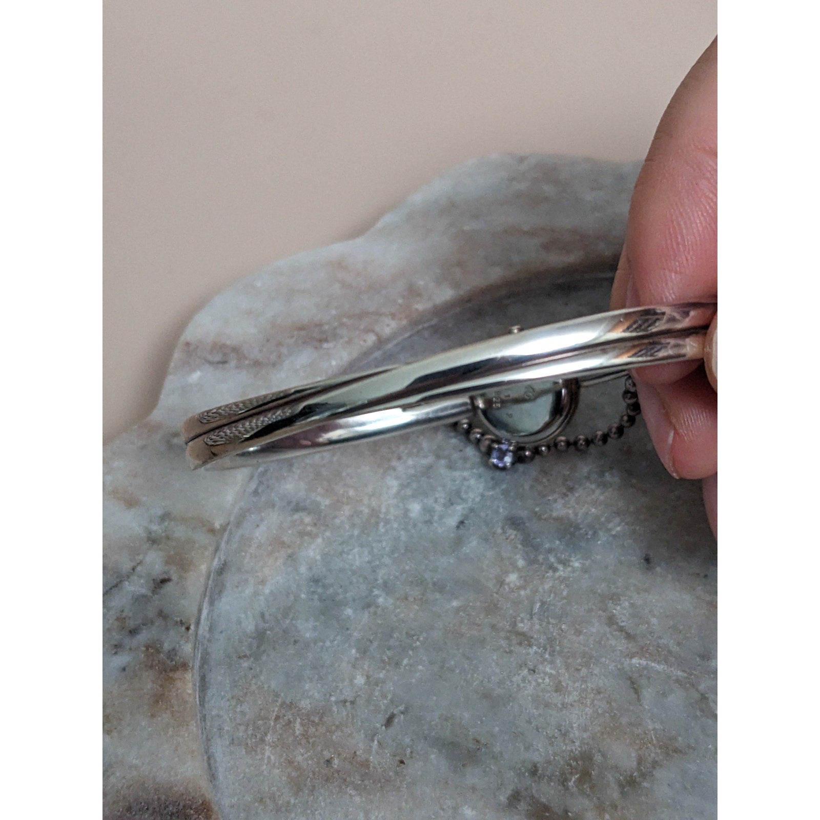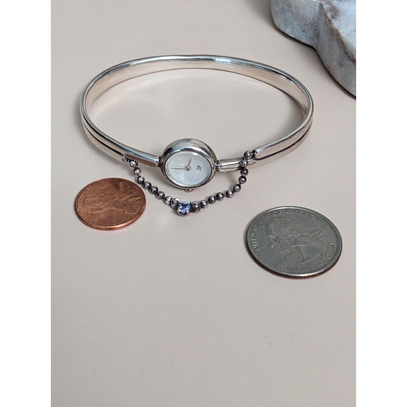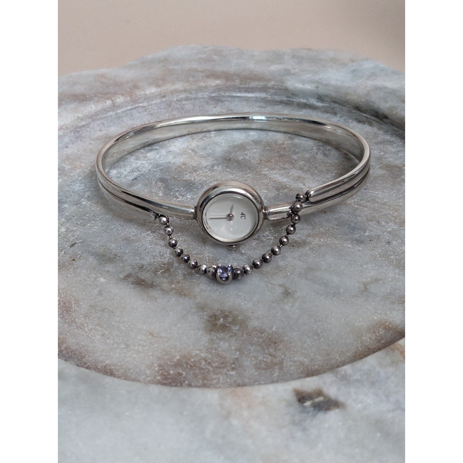 Vintage Andre Mouche Silver Tone Bangle Watch with Blue Floral Enamel Working