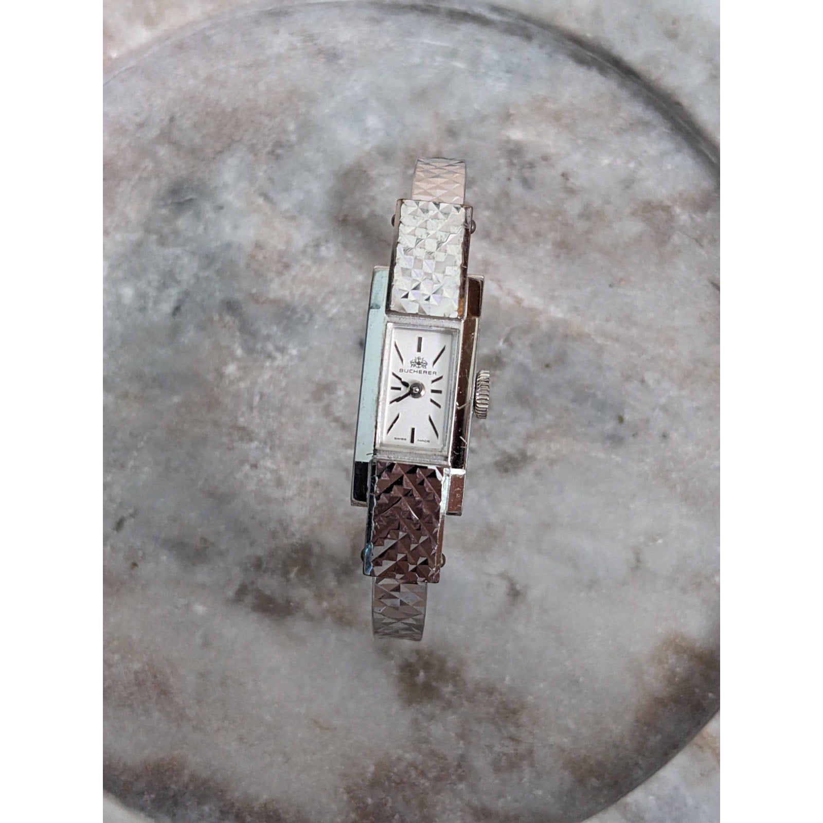 Vintage Andre Mouche Silver Tone Bangle Watch with Blue Floral Enamel Working