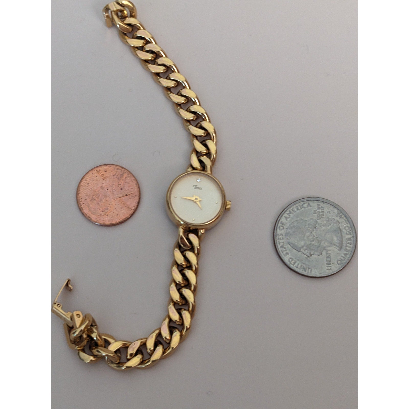 The battery has been replaced and the watch is ticking. The watch has not been tested for accuracy.