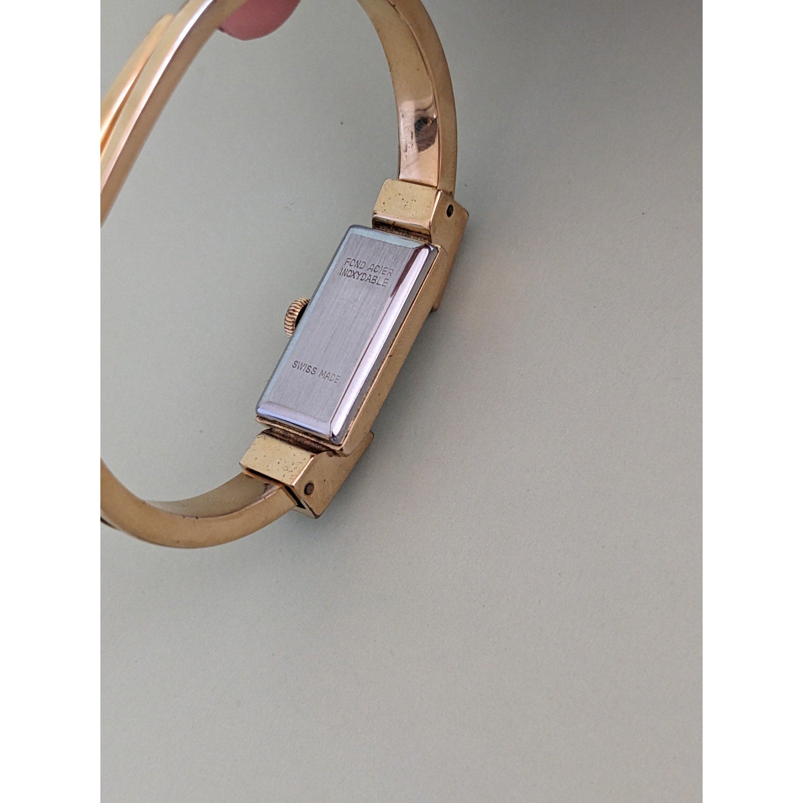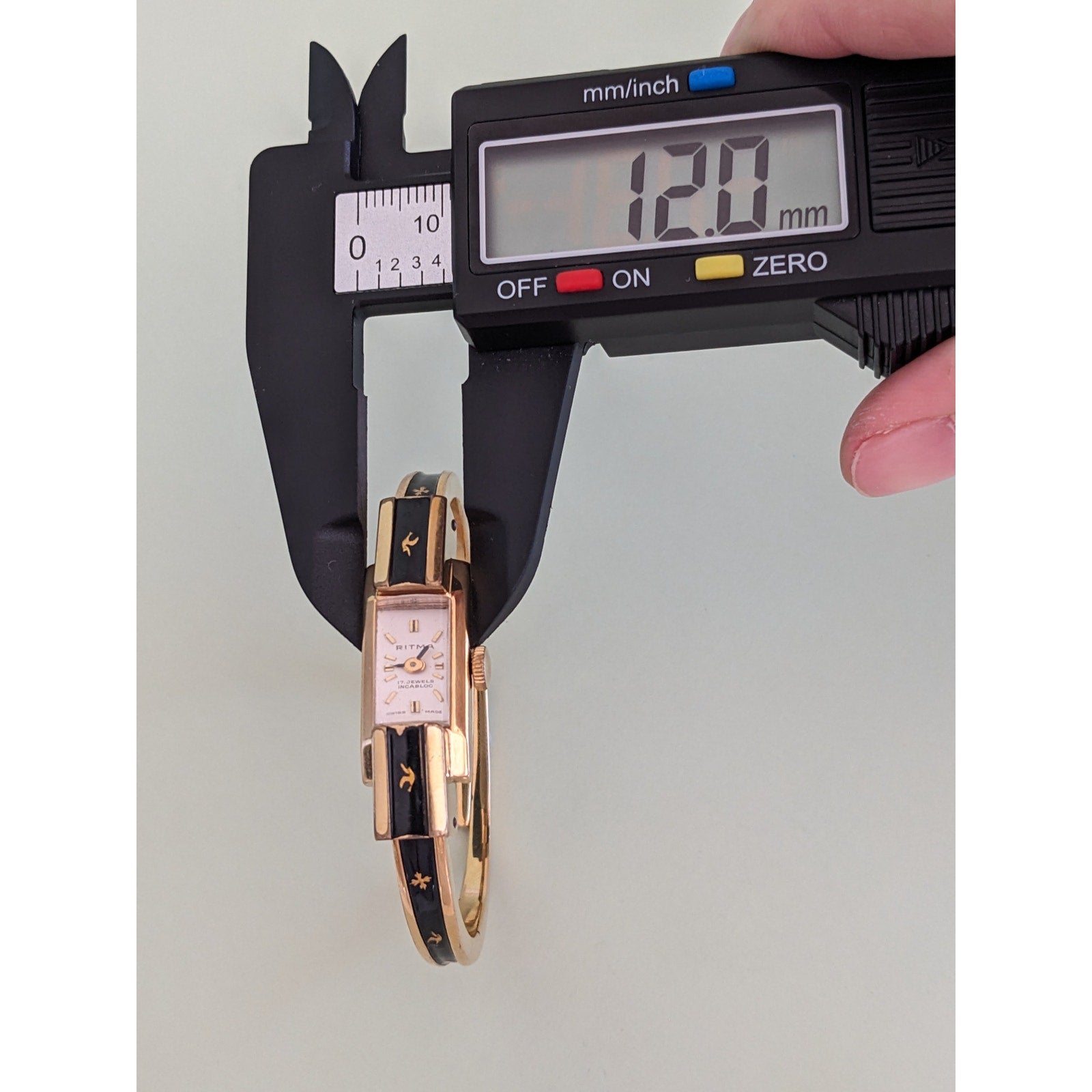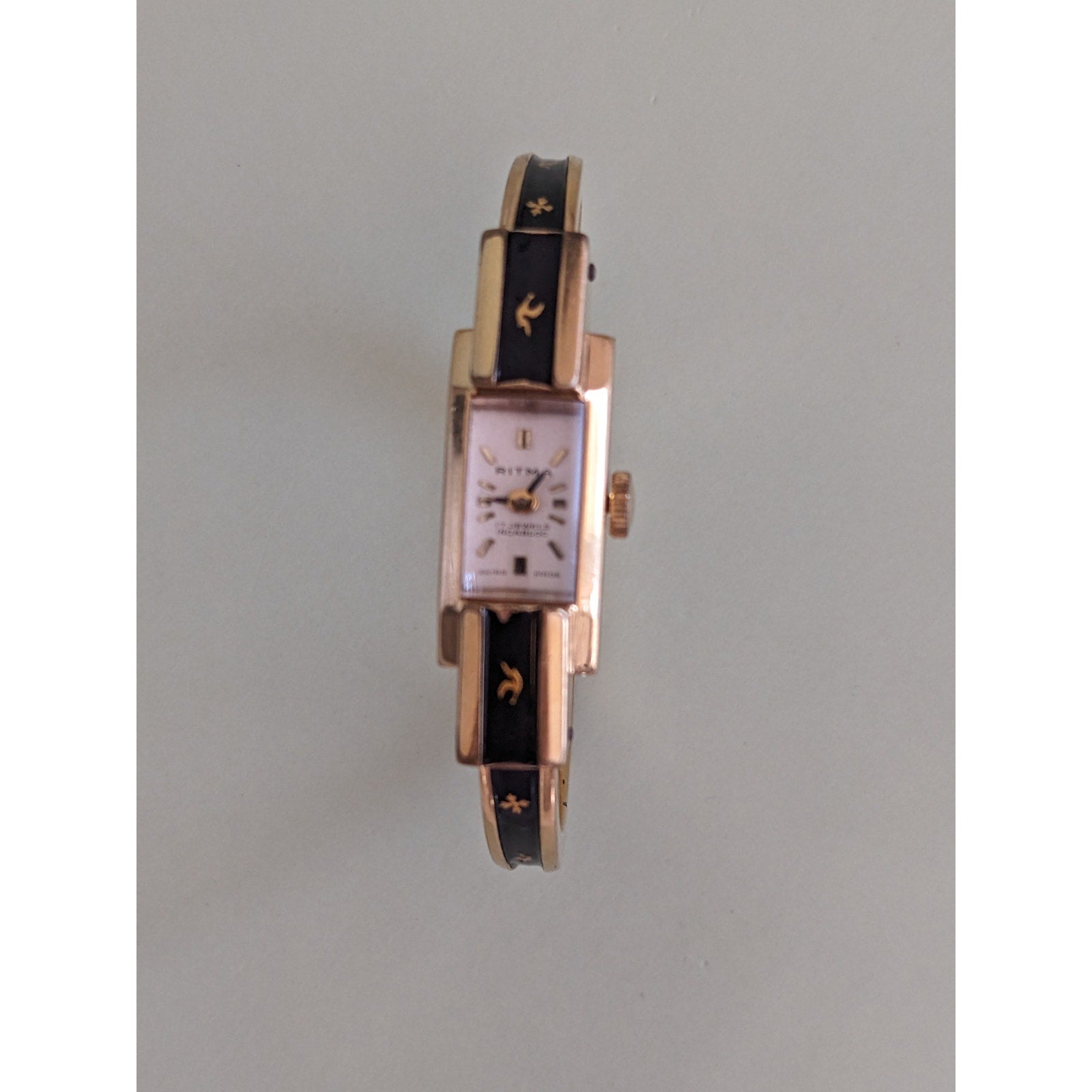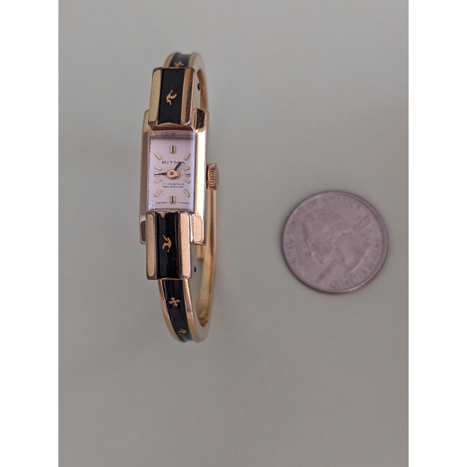 Vintage Ritma Manual Gold Tone Bangle Watch Black Enamel and Birds